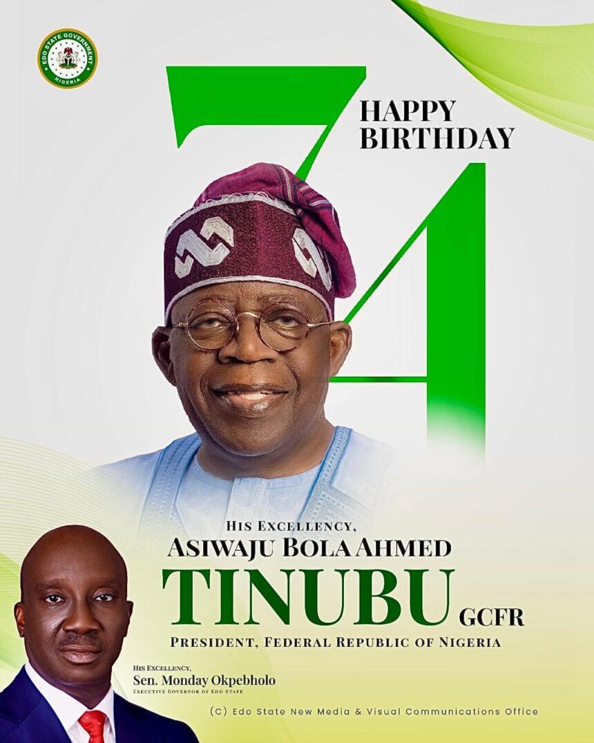 The Executive Governor of Edo State, His Excellency, Senator Monday Okpebholo has lauded President Asiwaju Bola Ahmed Tinubu on the occasion of his 74th birthday, praising his leadership style and commitment to national development.