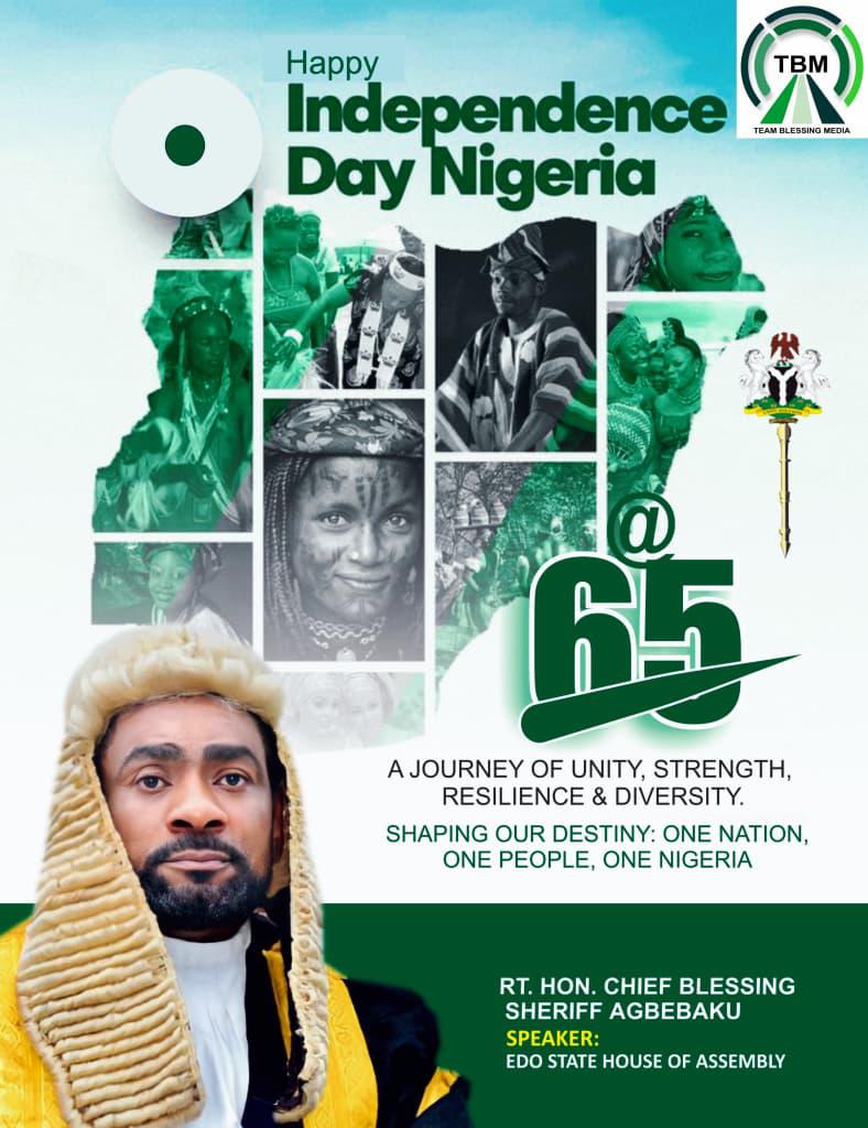 The Speaker Rt. Hon Blessing Agbebaku congratulates and celebrates our great country Nigeria and its citizens, as we celebrate the 65th anniversary of the nation’s with the theme “All Hands on Deck for a Greater Nation.”