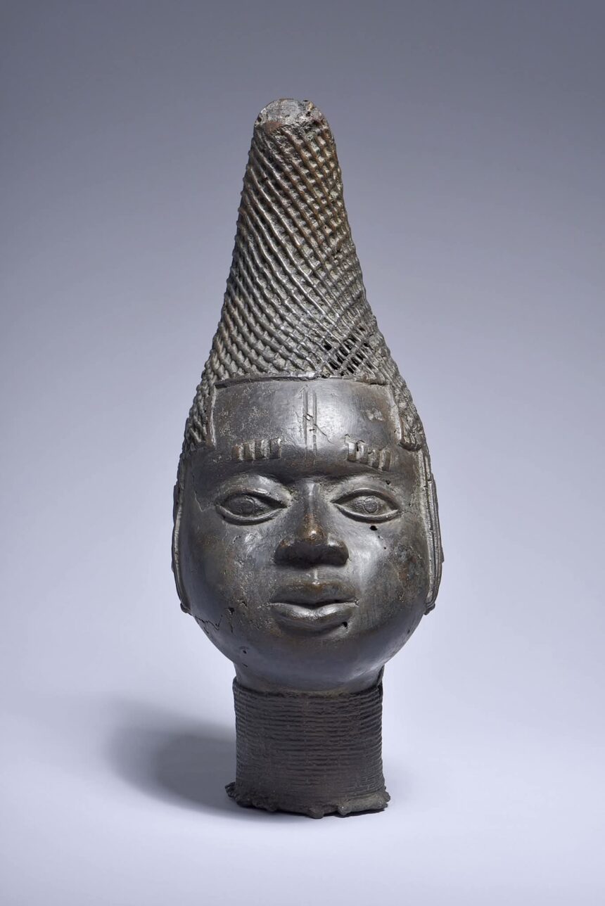 These heads are immediately recognizable. They feature a high, forward-projecting coral bead crown and an elongated coiffure known as ukpẹ okhokho or ukpe okhue, the “chicken beak” or “parrot beak” hairstyle. This projecting form, called ede Iyoba, is not merely decorative. It is a visual declaration of authority. Coral, reserved for royalty, reinforces her proximity to the Oba, while her facial markings (Ikharo) anchor her within Benin identity and lineage.