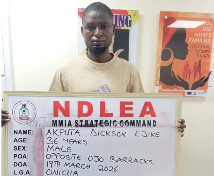 Babafemi disclosed that the agency’s Murtala Muhammed International Airport (MMIA) Strategic Command carried out a coordinated sting operation in the Ojo area of Lagos on Thursday, March 19, 2026. During the raid, officers apprehended 36-year-old Akputa Dickson Ejike, identified as a key figure in the syndicate.